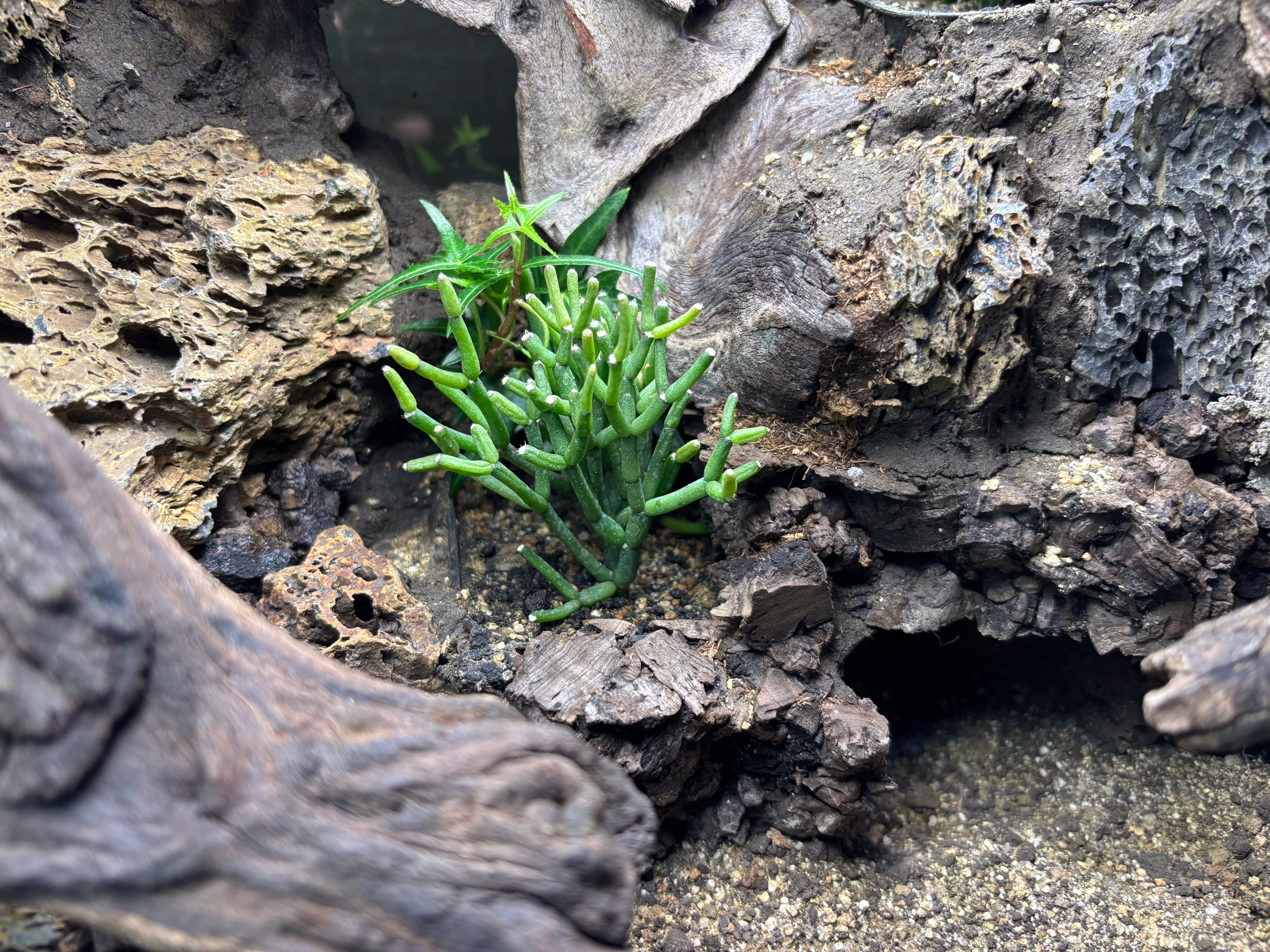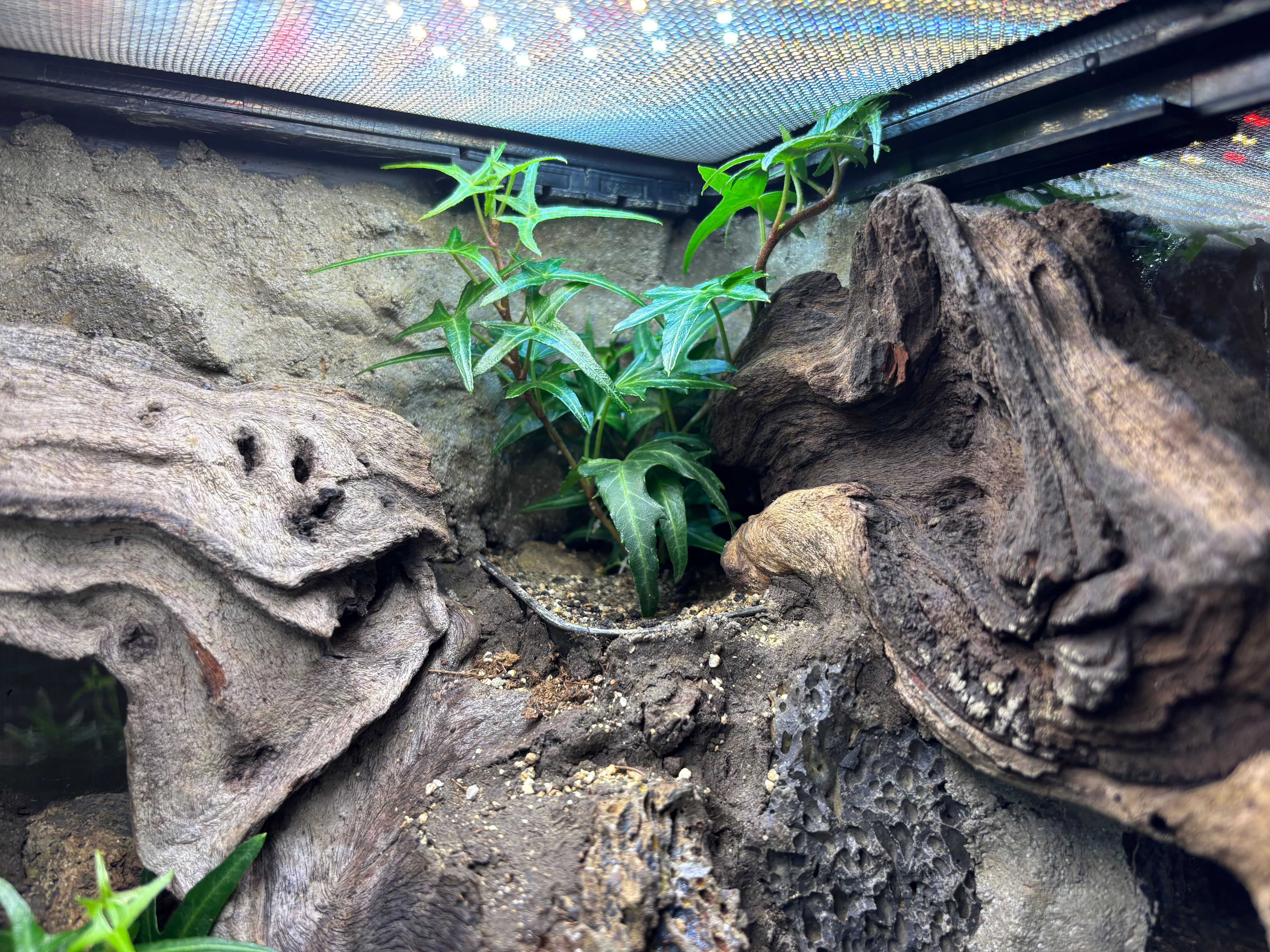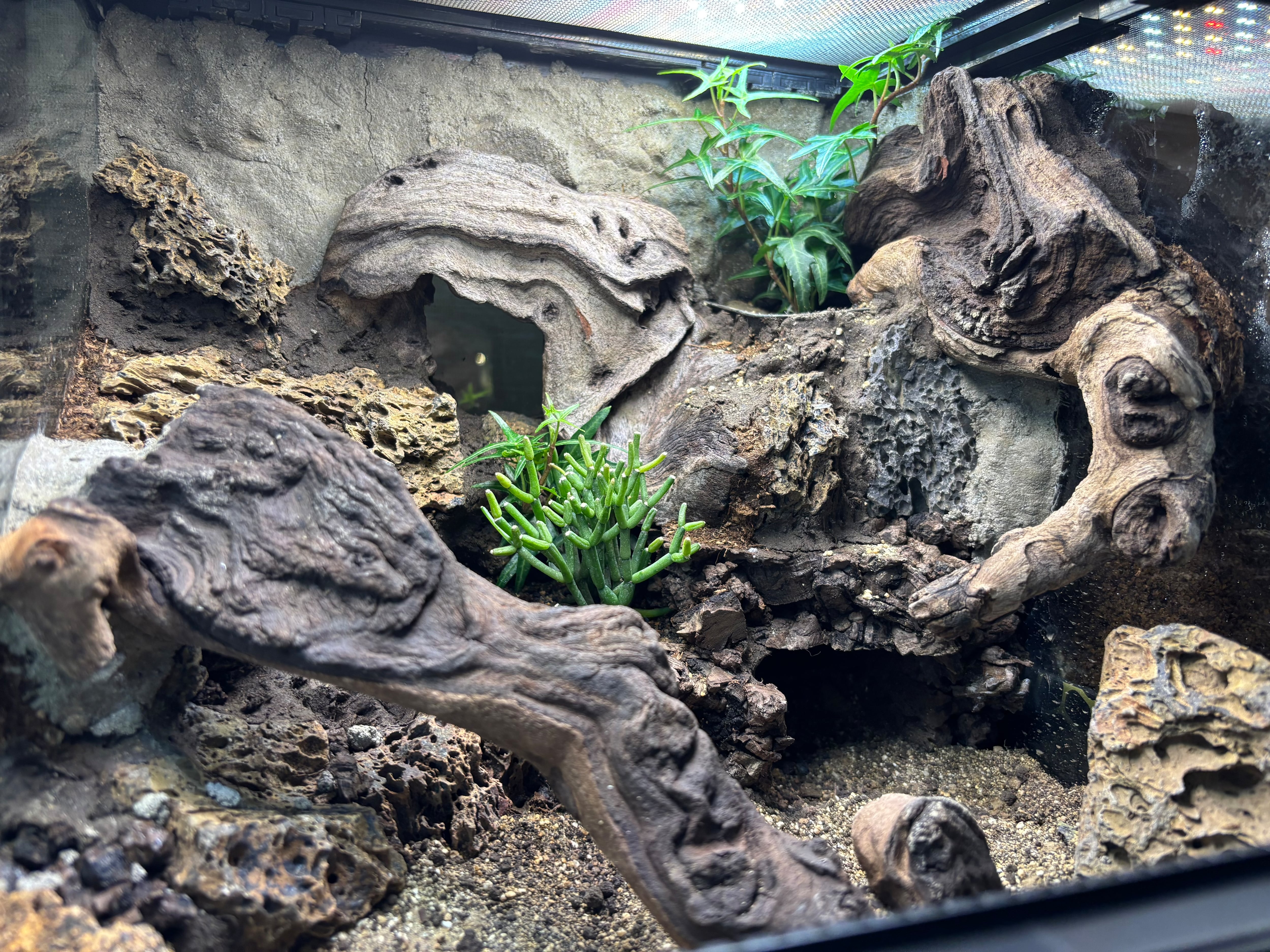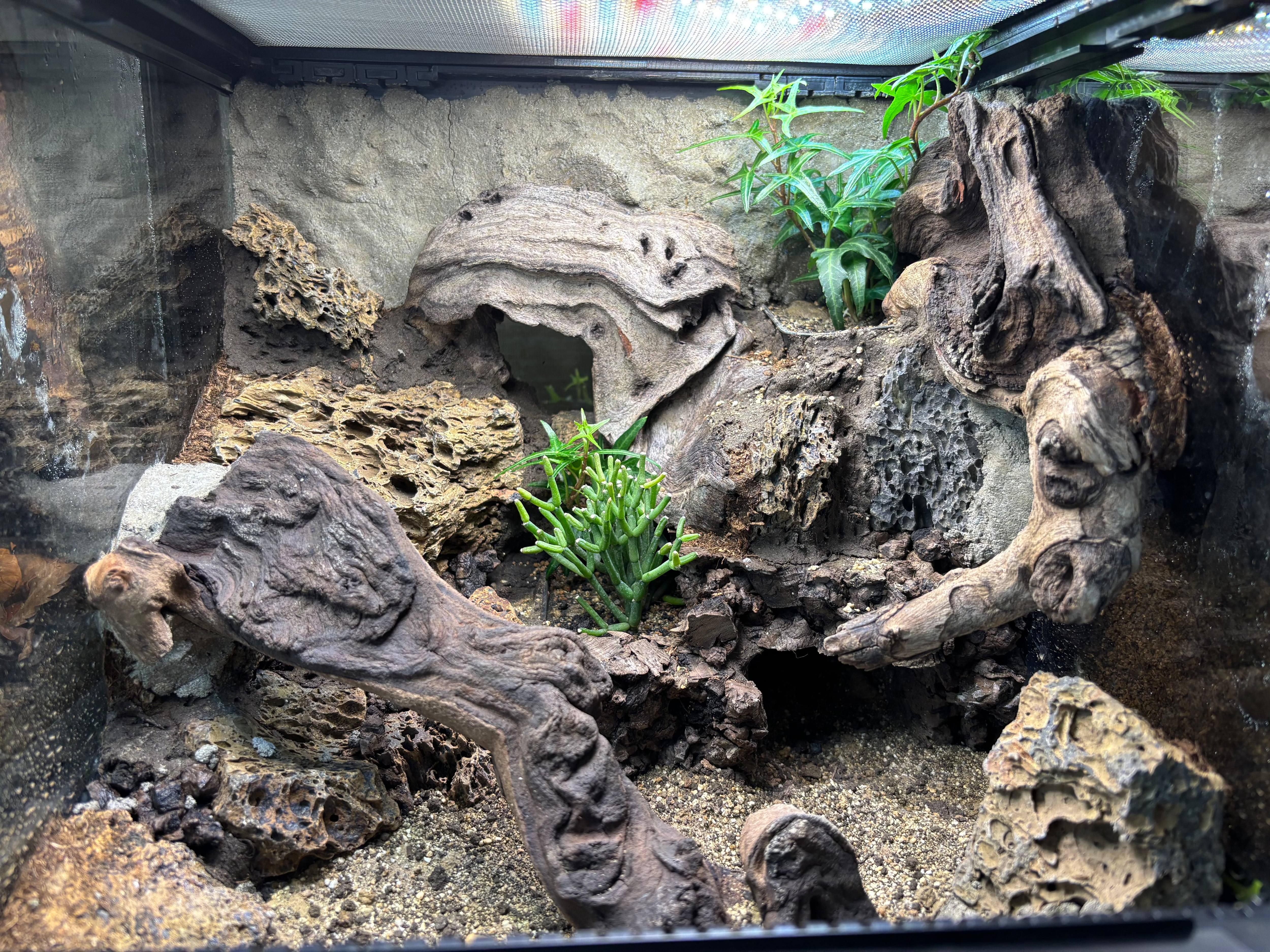 視覚的に相性の良い灼孔石とモパネウッドを用い、ある程度の立体活動のできるレイアウトと掘ることのできる床材で生体に様々な環境を選ばせてやることができます。地表性のヤモリ、レオパやトカゲなどに向いております。