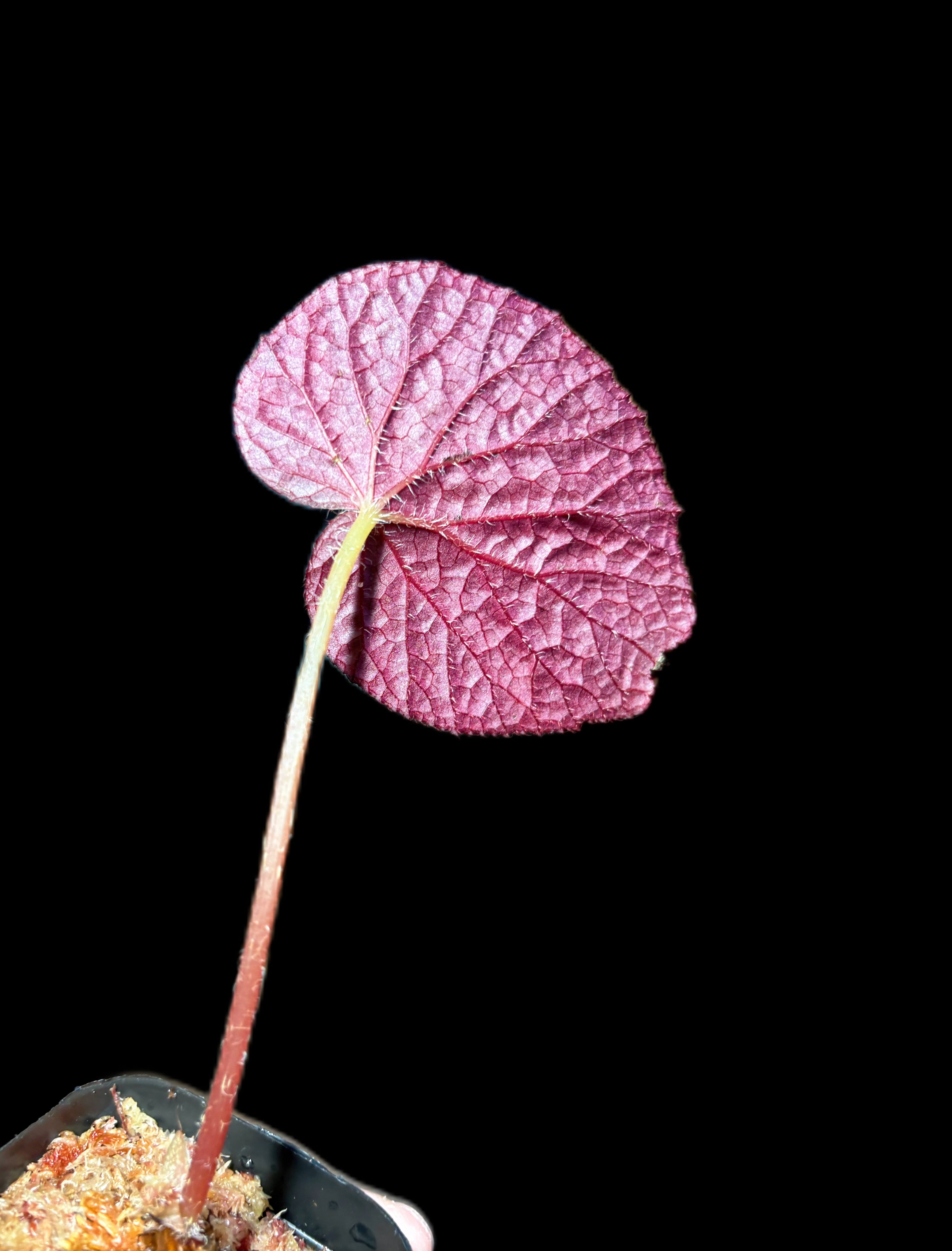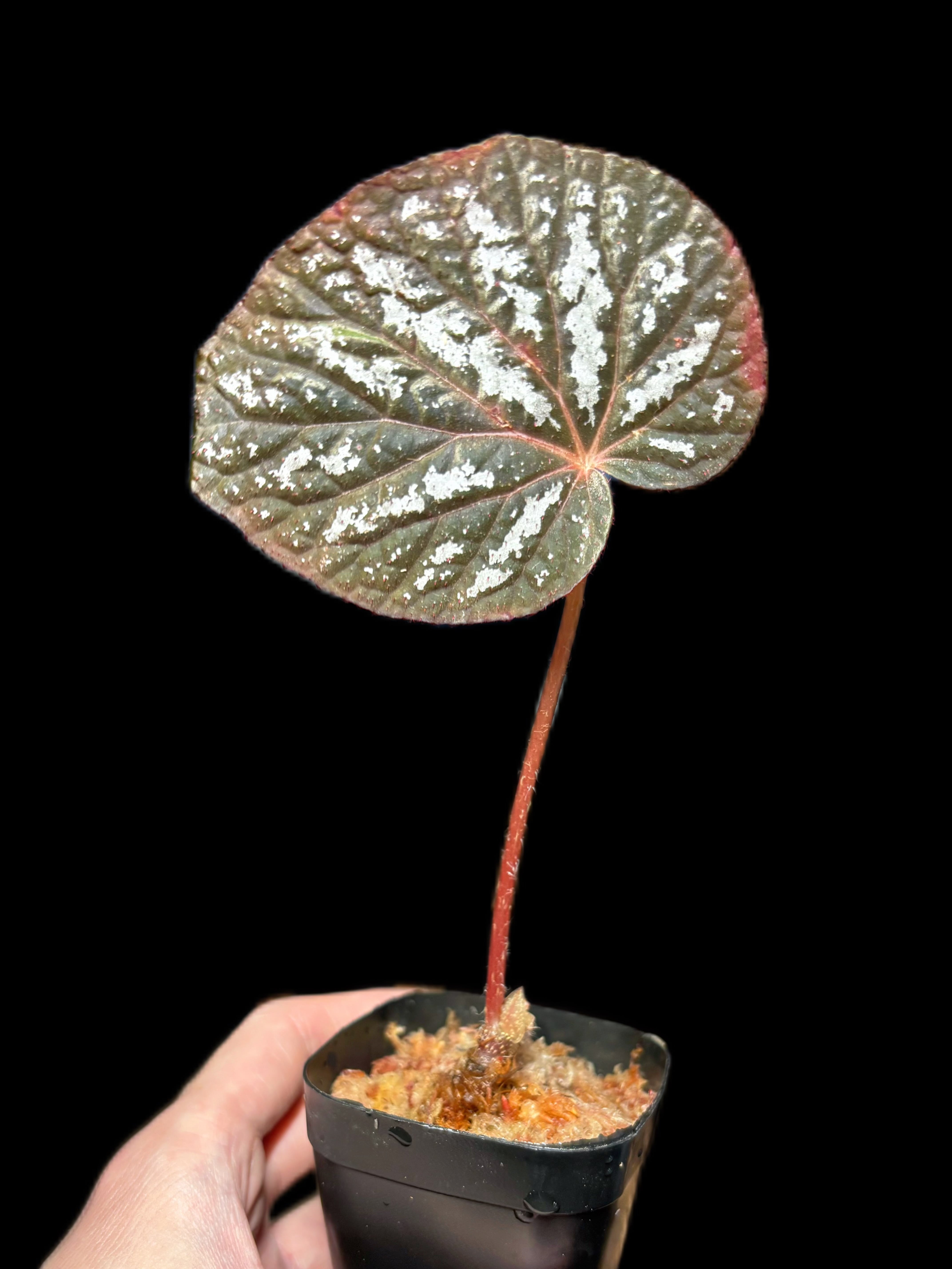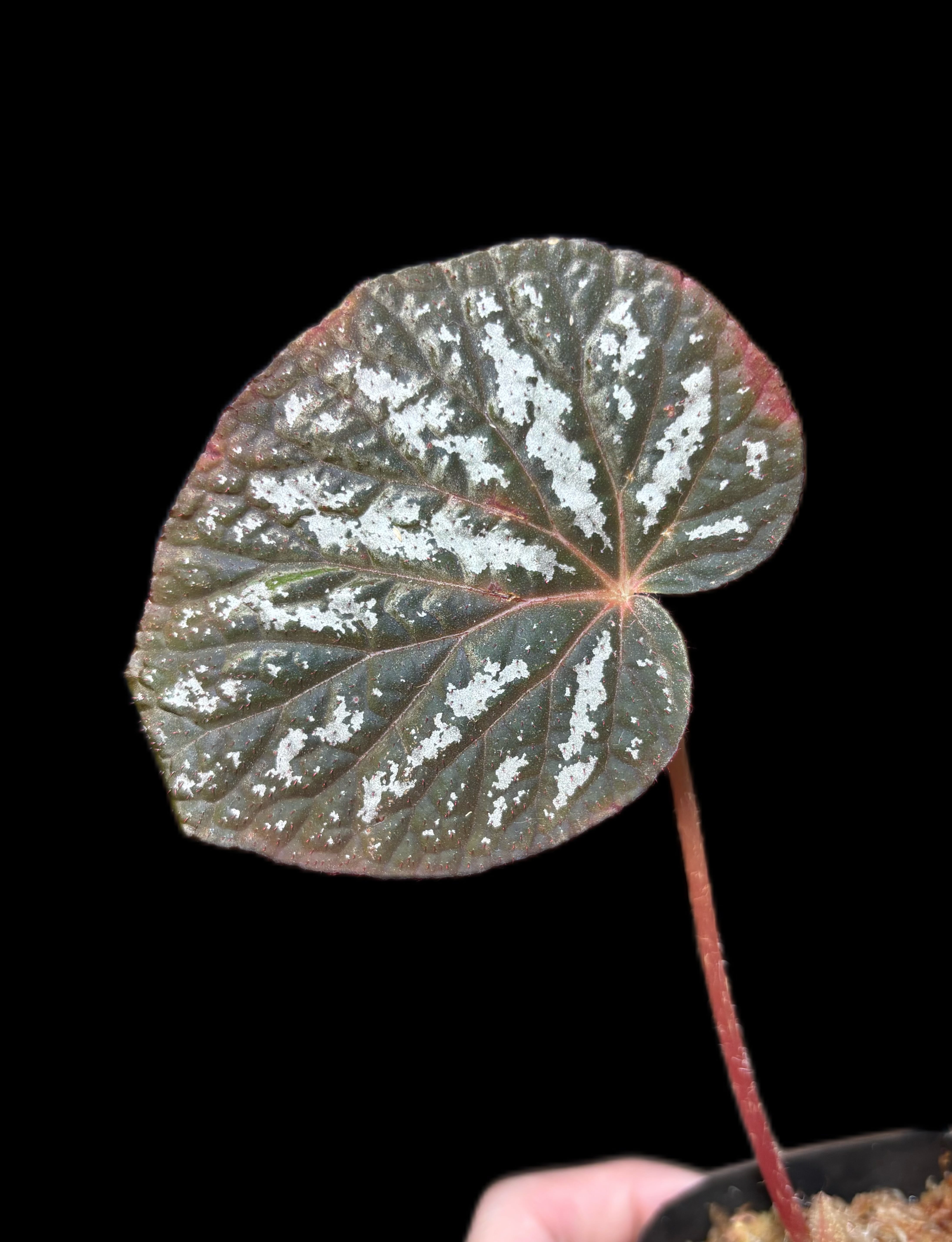 ・タイ原産の原種ベゴニアで、黒みがかったビロード調の葉に銀色の霜降り模様が入る非常に個性的な品種です。
